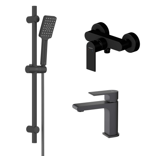 AQ1410MB ЛИРА смеситель для раковины 103, без донного клапана, матовый черный + AQ1460MB ЛИРА смеситель для душа, матовый черный + AQ2018MB ЛИРА душевой гарнитур 3jet 65 см, матовый черный