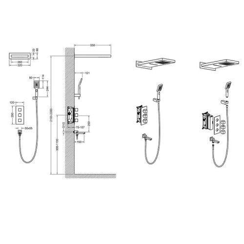 Оснащение Душевая лейка / Шланг для душа / Держатель душа / Шланговое подключение / Излив / Скрытая монтажная
