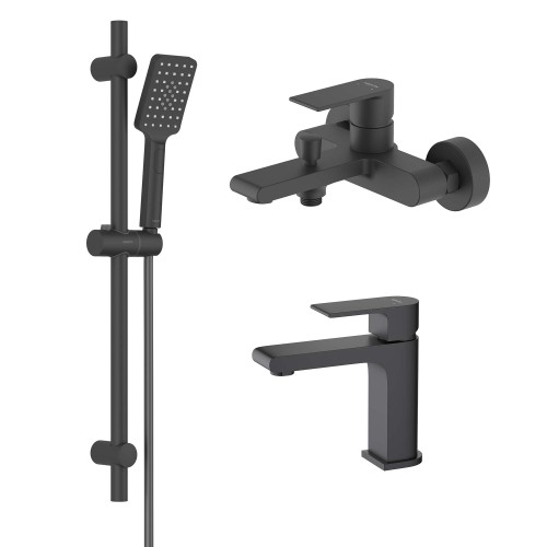 AQ1410MB ЛИРА смеситель для раковины 103, без донного клапана, матовый черный + AQ1440MB ЛИРА смеситель для ванны, матовый черный + AQ2018MB ЛИРА душевой гарнитур 3jet 65 см, матовый черный
